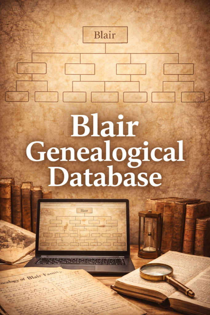 - a 60,000 database of Blairs – individuals, ancestral trees, documents, etc.